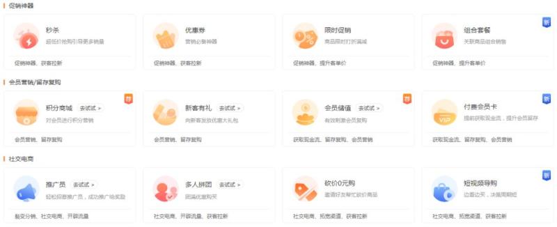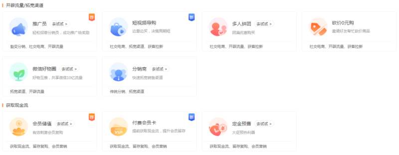 利用商家助手,可以获得商城的运营数据。在这个商城系统中,商家所获得的数据是独享的,并且相比第三方购物平台所获得的用户数据更详细。通过详细数据分析用户的购物喜好,适时推荐意向较高的商品,反过来说,可以帮助商家更详细描绘精准用户画像,促进商家运营决策的正确性。咱们的小程序商城拥有多样化的营销功能,营销目的多达7类,有拓宽渠道的推广员分销商、拼团、砍价、好物圈、新功能短视频导购,帮助电商企业在初期、淡季开辟流量。还有获取现金流的会员储值、付费会员卡、定金预售功能,帮助电商企业做好会员营销,促进留存复购。更有秒杀、限时促销、组合套餐等促销神器帮助商家提升客单价、实现获客拉新;以及价格日历、到店自提、同城配送等面向垂直行业的功能覆盖多行业、全场景。