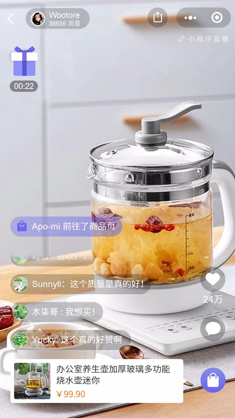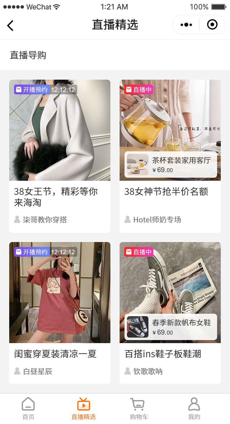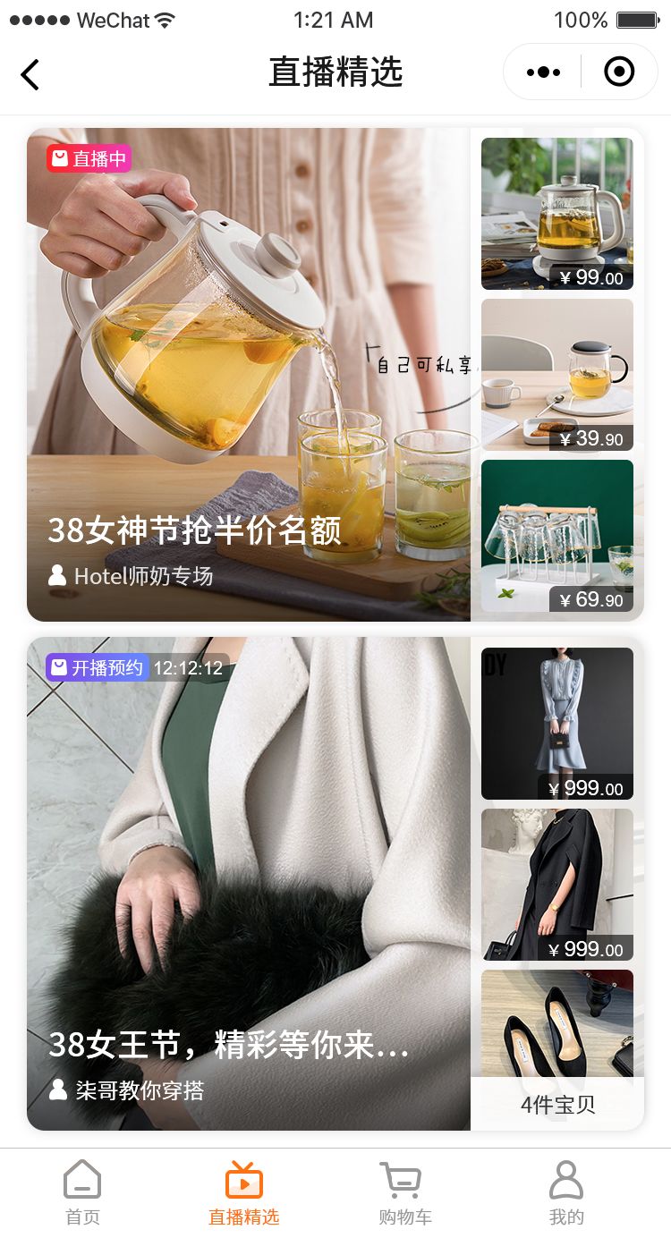 目前小程序直播正在火热公测中,接到公测邀请的商家可在「微信小程序后台-功能-直播」中申请开通直播能力,无需额外申请直播资质。通过审核后,借助小程序或商城,最快1天即可完成开发,并上线带有直播能力的微信小程序。同时,小程序直播运营十分简单,最快20分钟即可上手,商家可通过小程序直播提供的点赞、评论、抽奖、优惠券派发等能力,与用户产生丰富互动。基于微信生态,小程序直播支持用户订阅直播间,订阅后用户可收到开播提醒,方便用户回访直播间。小程序直播支持一键分享到微信聊天,方便好友或社群成员访问。此外,也支持在公众号菜单、公众号文章等位置内嵌小程序,轻松为直播间引流,由于通过公众号引流的粉丝带有一定的忠诚度,转化会更容易。小程序直播目前为公测阶段,符合以下条件且收到公测邀请的商家,可在「微信小程序后台-功能-直播」中申请开通小程序直播功能。共有6个条件,其中条件1、2、3必须同时满足,条件4、5、6满足其一即可。满足其一即可:电商平台、商家自营-百货、初级食用农产品、食品、酒/盐、图书报刊/音像/影视/游戏/动漫、汽车/其他交通工具的配件、服装/鞋/箱包、玩具/母婴用品、家电/数码/手机、美妆/洗护、珠宝/饰品/眼镜/钟表、运动/户外/乐器、办公/文具、鲜花/园艺/工艺品、汽车内搭/外饰、家居/家饰/家纺、机械/电子器件、在线视频课程、直播、视频条件6:主体在微信生态内近1年广告投放实际消耗金额大于1万元1. 尚未满足服务类目要求的商家,建议先在微信小程序后台添加符合条件的服务类目,再申请开通小程序直播功能。2. 申请由微信官方进行处理,审核通过后即可使用小程序直播功能。1. 商家可在「微信小程序后台-功能-直播-直播间管理」中创建直播间。2. 同一个小程序至多可创建50个直播间,一天内至多支持同时直播50场,每个直播间直播时长不能超过12小时。