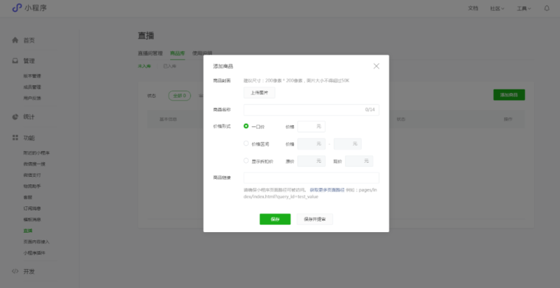 1. 商家可在「微信小程序后台-功能-直播-商品库」中添加商品/服务。2. 添加商品/服务后,需提交微信审核,审核通过后商品/服务才能入库。3. 已入库的商品可导入直播间,在直播间的商品列表中展示。注:微信审核时长为1-7天,建议商家将直播的商品/服务提前录入到商品库中。